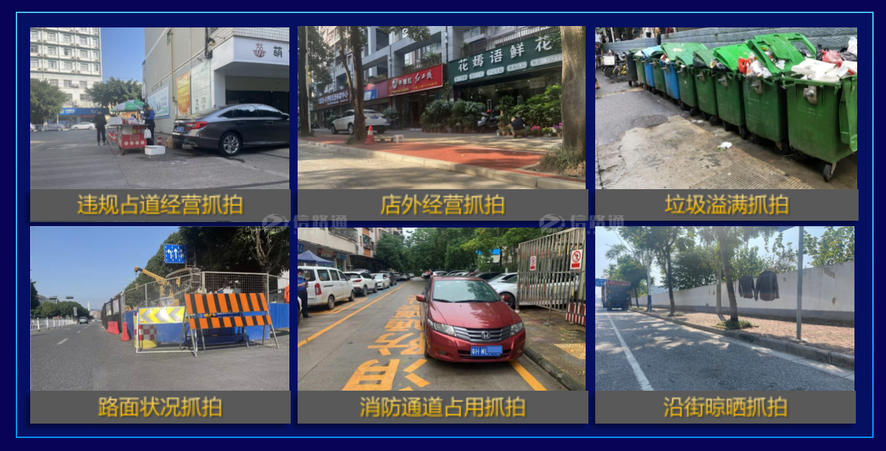 “新一代”視頻巡檢車還可以進行AI典型城管秩序類抓拍:違規(guī)占道經(jīng)營、店外經(jīng)營、垃圾溢滿、路面狀況、消防通道占用、沿街晾曬等。